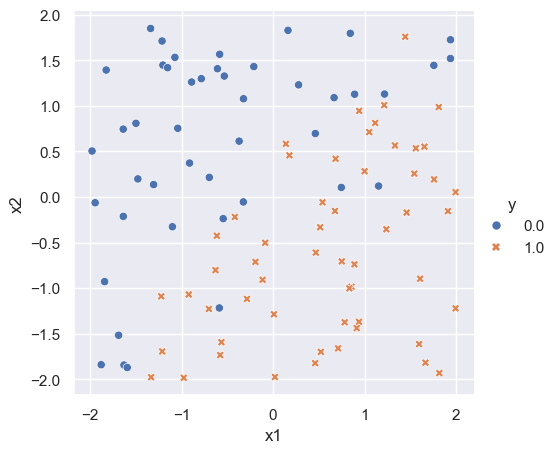 logit_plot = sns.relplot(df, x='x1', y='x2', hue='y', style='y')