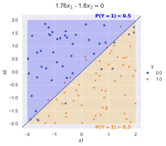 logit_plot.ax.annotate(r'$\bf P(Y=1)>0.5$', (0.5, -2.2), color='darkorange')Text(0.5, -2.2, '$\\bf P(Y=1)>0.5$')