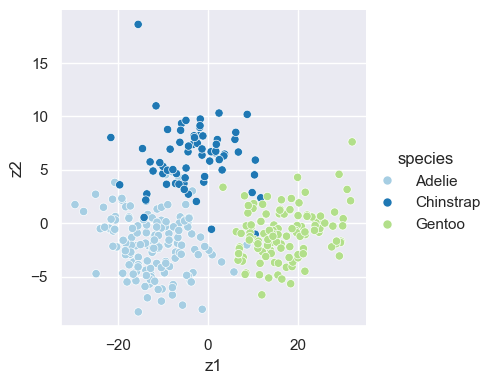 pca_plot = sns.relplot(z_df, x='z1', y='z2', hue='species', palette=sns.color_palette("Paired", 3), height=4)